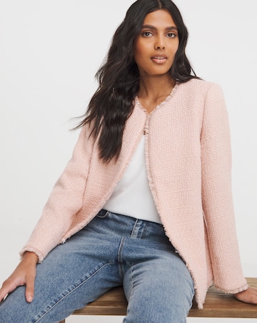 This collarless boucle blazer is a timeless layering piece to take you from season to season. Elevated with silver clasp fastenings, finished with delicate frayed hem lines an...